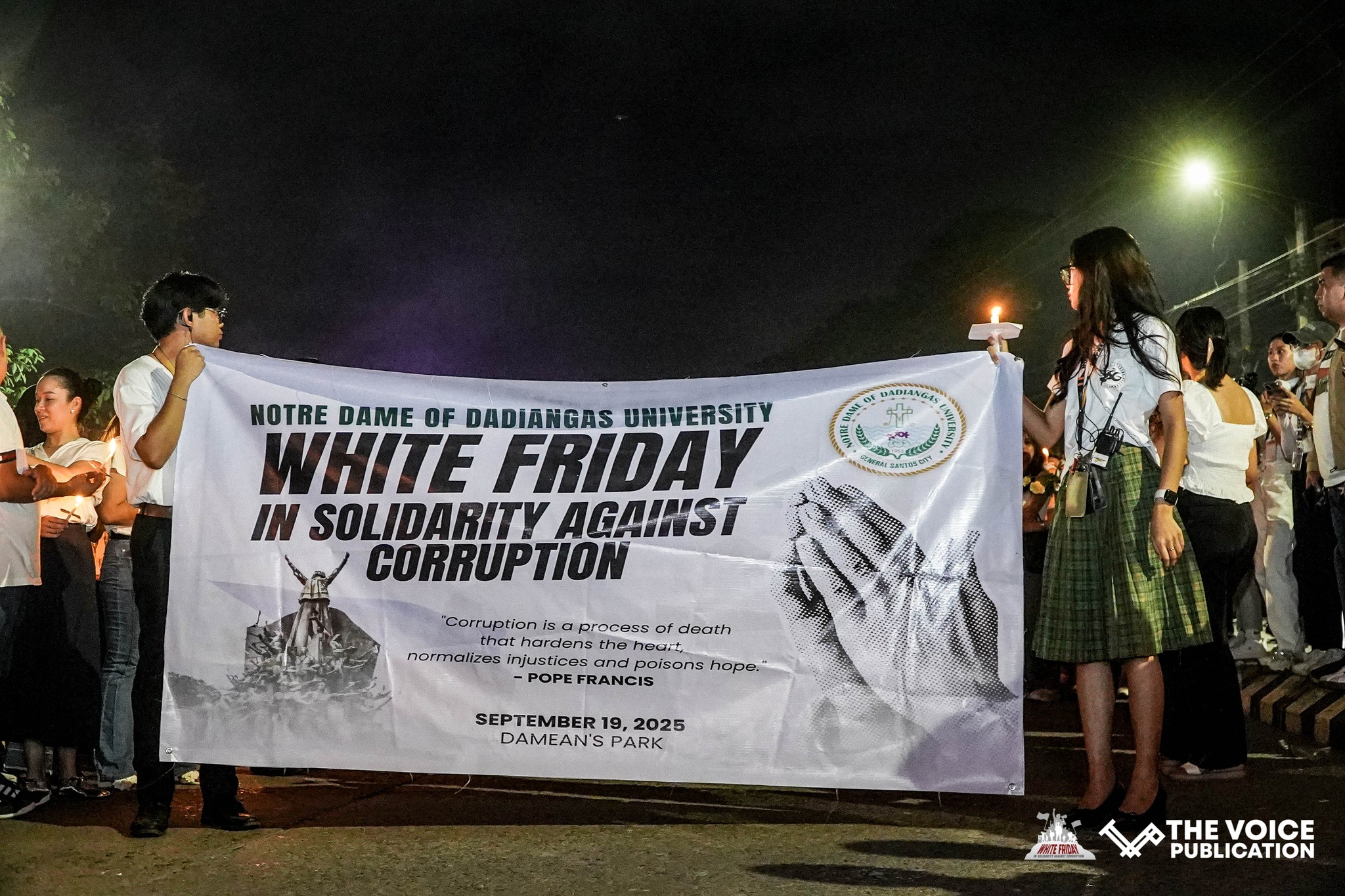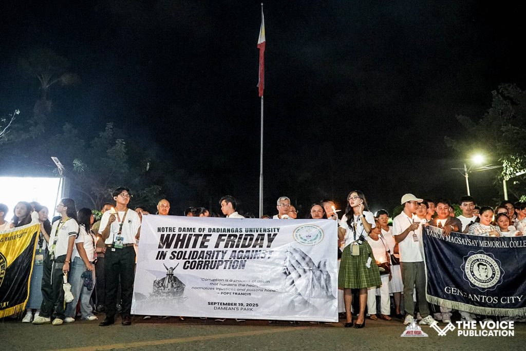 White Friday, a citywide silent protest joined by Notre Dame of Dadiangas University, gathered participants at Plaza General Santos on September 19, 2025 to denounce alleged public-sector corruption, so organizers staged Hakbang: Silent Expression of Solidarity Against Corruption that culminated in a Holy Eucharist and a mass lighting of candles.