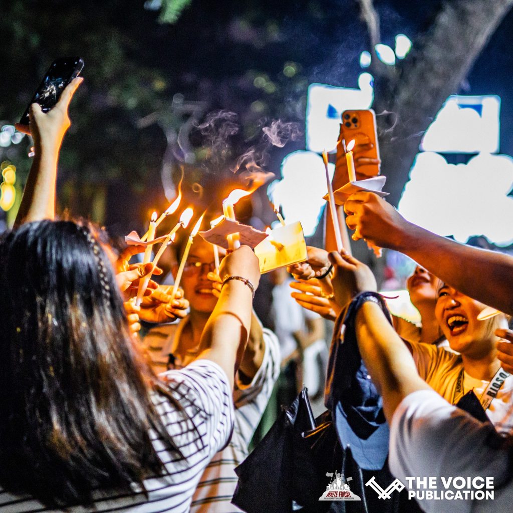Participants carried candles paired with flowers such as sampaguita, ilang-ilang, roses, chrysanthemums, and anthuriums as tokens of peace, so the vigil filled the plaza and nearby streets with light and floral offerings.