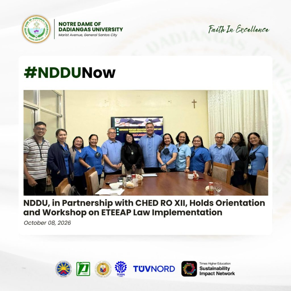 Notre Dame of Dadiangas University (NDDU), in partnership with the Commission on Higher EducationโRegional Office XII (CHED RO XII), successfully conducted an Orientation and Workshop on the Implementation of Republic Act No. 12124, otherwise known as the Expanded Tertiary Education Equivalency and Accreditation Program (ETEEAP) Law, on October 7, 2025, at the university campus in General Santos City.