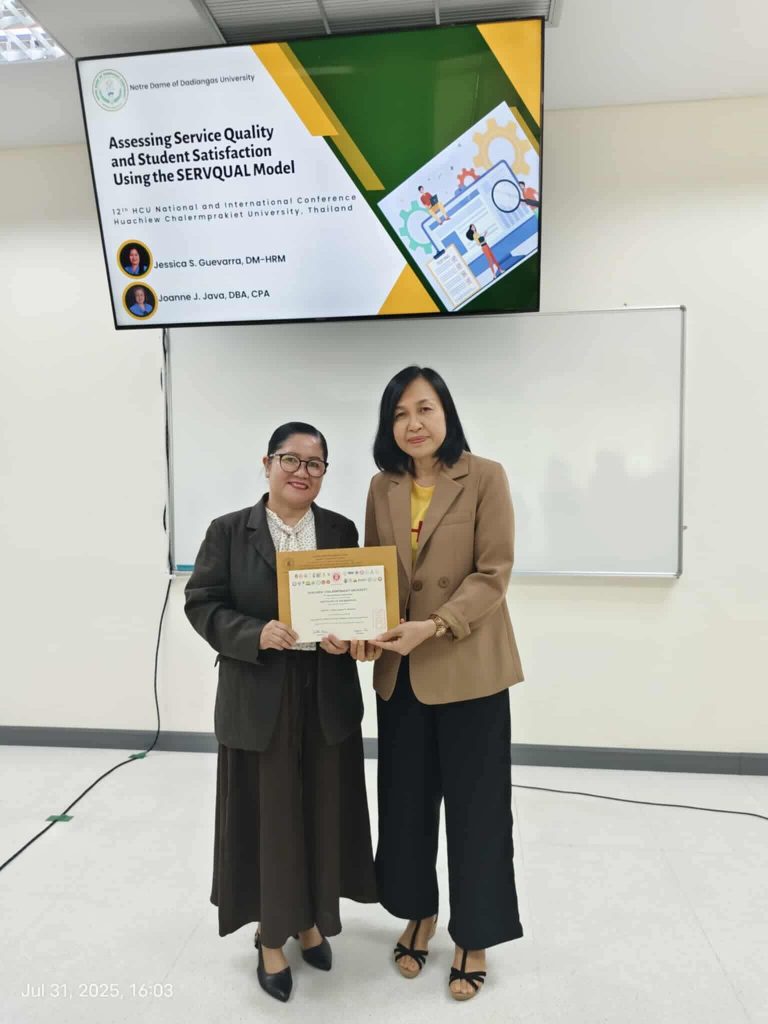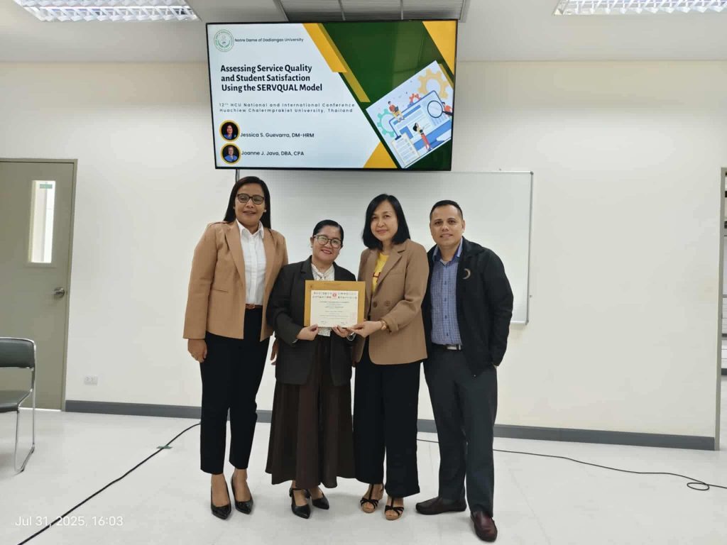 ๐——๐—ฟ. ๐—๐—ฒ๐˜€๐˜€๐—ถ๐—ฐ๐—ฎ ๐—ฆ. ๐—š๐˜‚๐—ฒ๐˜ƒ๐—ฎ๐—ฟ๐—ฟ๐—ฎ, faculty researcher of Notre Dame of Dadiangas University (NDDU), presented her co-authored study โ€œ๐˜ผ๐™จ๐™จ๐™š๐™จ๐™จ๐™ž๐™ฃ๐™œ ๐™Ž๐™š๐™ง๐™ซ๐™ž๐™˜๐™š ๐™Œ๐™ช๐™–๐™ก๐™ž๐™ฉ๐™ฎ ๐™–๐™ฃ๐™™ ๐™Ž๐™ฉ๐™ช๐™™๐™š๐™ฃ๐™ฉ ๐™Ž๐™–๐™ฉ๐™ž๐™จ๐™›๐™–๐™˜๐™ฉ๐™ž๐™ค๐™ฃ ๐™๐™จ๐™ž๐™ฃ๐™œ ๐™ฉ๐™๐™š ๐™Ž๐™€๐™๐™‘๐™Œ๐™๐˜ผ๐™‡ ๐™ˆ๐™ค๐™™๐™š๐™กโ€ at the 12th Huachiew Chalermprakiet University (HCU) International Conference, held on July 30โ€“31, 2025, in Thailand.