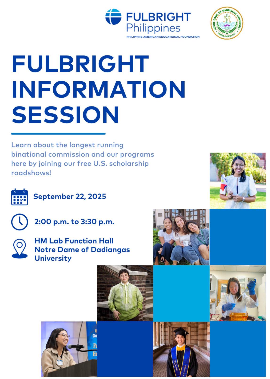 ๐๐ฆ๐ฏ๐ฆ๐ณ๐ข๐ญ ๐๐ข๐ฏ๐ต๐ฐ๐ด ๐๐ช๐ต๐บ, ๐๐ฉ๐ช๐ญ๐ช๐ฑ๐ฑ๐ช๐ฏ๐ฆ๐ด โ Fulbright Philippines, through the Philippine-American Educational Foundation, is set to bring its scholarship roadshow to Notre Dame of Dadiangas University (NDDU) on September 22, 2025, at the HM Lab Function Hall. The information session will run from 2:00 p.m. to 3:30 p.m. The event is part of Fulbrightโs continuing efforts...Read More
